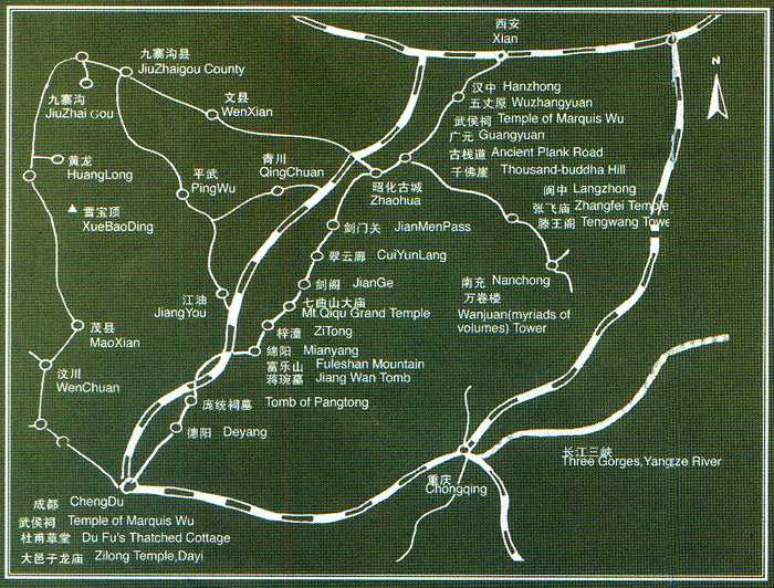 The north of Jianmen is the emphasis scenery Maijishan, Lishan, and the ancient town Xian; the west is abuts on Huanglong, Jiuzhai, Wanglang, and Tangjiahe natural protection area, and connect with Cultural city Chengdu, Qingchengshan-----Dujiangyan scenery; the north is connecting with Langzhong.