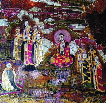 Jueyuan temple wall pictures belong the wudaozi style and the local characters. The framework of it are very close, and continuous. Every pictures are connected by the mountains, rivers, clouds, trees, and houses with the interesting and typical cartoon quality. The art are very complicated and beautiful color. In the painting, it adopted the describe, with fully crave the facial expression and feeling. The complicated wall paper can be listed as the elite. Since the ancient time, many learned people visit the juyuantemple to enjoy the pictures .